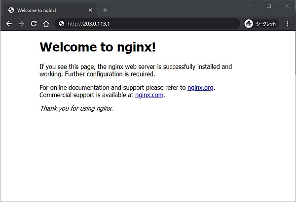 少し複雑になりましたが、rules.http.paths.backend.service配下に転送先のサービス名が指定されていることが分かります。複雑な分だけ柔軟な転送設定が可能なので、色々試してみてください。設定ができたら、実際にアクセスしてみましょう。http://<ノードのIPアドレス>でブラウザからアクセスできる状態になっているはずです。