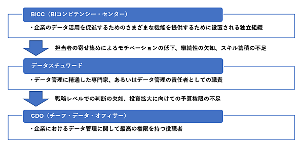 企業におけるデータ管理に関して最高の権限を持つ役職者という意味ですが、実際にはBICCの長、あるいはデータスチュワードの最上位者という位置づけになります。ただし、それまでと異なるのは、経営に関する権限も持っていることです。これには、BICCの中立性やデータスチュワードの専門性だけでは、データ管理に関わる施策を推進できなかった反省が活かされています。