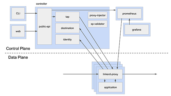 Linkerdのアーキテクチャは、大きく「コントロールプレイン」と「データプレーン」に分けられます。コントロールプレーンは専用のネームスペースで動作するサービスです。これらのサービスはテレメトリーデータの集約、ユーザー向けAPIの提供、データプレーンプロキシへの制御データの提供などを実行します。これらのサービスが一体となって、データプレーンを動作させます。