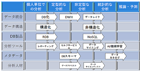 この「ビッグデータ解析」においては、「非定型な分析」で使われるものとは異なったテクノロジーが必要となります。データウェアハウスとは異なる構造を持つデータレイクや、RDBMSとは異なる種類のNoSQLデータベースがその例です。次回は、これらの「統計的な分析」=「ビッグデータ解析」で使われるテクノロジーについて解説します。