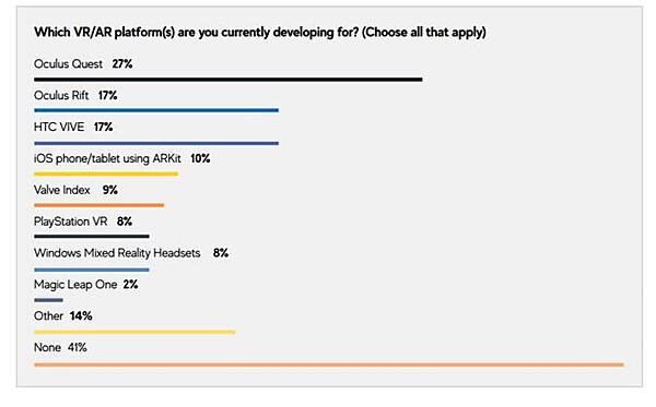 この調査によれば、開発者の約52%が最も関心あるVRプラットフォームにOculus Questをあげ、約27%はOculus Quest系デバイス向けのVR/ARタイトルを開発中と答えています。