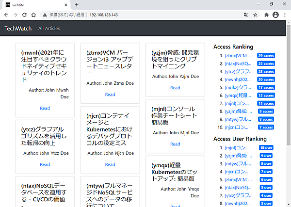 <前日日付>は操作を行う前日の日付をYYYY-MM-DDの形式で指定します。例えば、作業日が2021年5月21日なら前日は2021年5月20日なので2021-05-20と指定します。ブラウザを更新すると、以下のように記事の一覧やランキングが表示されます。