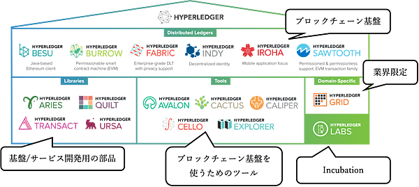 また、このプロジェクトでは、ビジネスユースのブロックチェーン技術を用いたシステム構築を目的として、オープンソースによる分散元帳フレームワークの開発や実証実験などのさまざまなアプローチをしています。下記の6種類のフレームワークと4種類の基盤/サービス開発用の部品、5種類のブロックチェーン基盤を使うためのツール、業界限定のプロジェクトおよびプロジェクト化前の「Hyperledger Labs」と呼ばれるIncubationが含まれています。