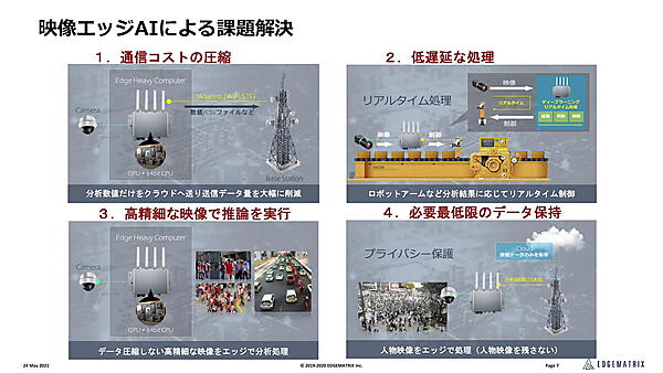 この考え方に基づいて同社は、AIアプリケーションの実行環境を備えたエッジデバイス「Edge AI Box」や、それらを統合管理する「EDGEMATRIXサービス」などを主力ソリューションとして展開している。