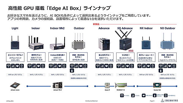 「Edge AI Box」は、CPUやGPUを内蔵したボックスマシンであり、例えばARM製プロセッサとNVIDIA製GPUを搭載したボードコンピュータ「NVIDIA Jetson TX2」を搭載したモデルなどがある。エッジサイドでAIアプリケーション(深層学習の推論モデルなど)を走らせるのに必要な演算能力を備え、さらには環境耐性などにも配慮した幾つかのバリエーションを用意。5G通信への対応など最新技術へのキャッチアップも抜かりはない。「ユーザーがいち早く現場での運用に持ち込めるよう、用途に応じて最適モデルを選択しやすくしています」とは長谷川氏の弁だ。