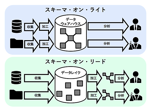 データウェアハウスでは、データ分析を行うユーザーの要件をあらかじめ定義したうえでデータモデルを設計し、それに合わせて必要なデータを収集、加工してから蓄積するという順序になります。このやり方は、データの蓄積(書き込み)の時点で、データベースの構造(スキーマ)がすでに決定されているという意味で、スキーマ・オン・ライト(Schema on Write)と呼ばれます。