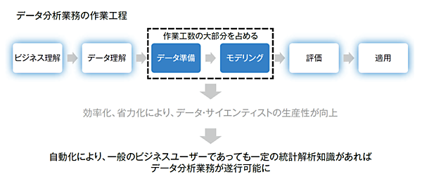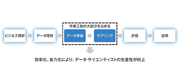 これらの工程は、経験豊富なデータ・サイエンティストでも試行錯誤的なアプローチが要求されるため、非効率になりがちでした。そこで複数の経験の少ない要員に比較的単純な作業を割り当て、並行作業をさせることで生産性の向上を図っていましたが、かえって指導や監督に要する工数が増大し、短期的には生産性が低下するという結果を招いていました。さらに今後は、経験の有無にかかわらず要員の確保自体が難しくなることが予想されており、データ分析業務の生産性向上には新しいテクノロジの導入が求められています。
