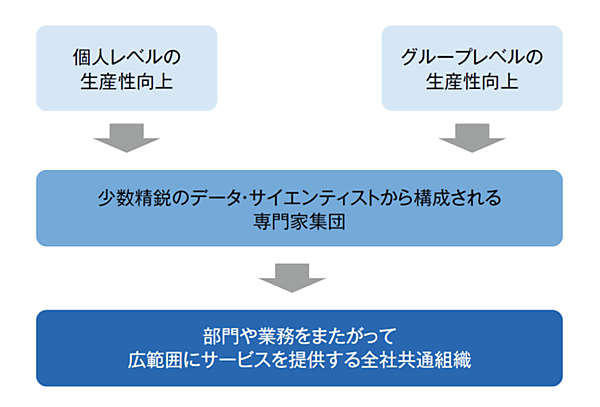 その結果、非効率な作業分担や多大な育成工数を必要とするピラミッド型組織を維持する必要がなくなり、少数精鋭のデータ・サイエンティストから構成される専門家集団として、垂直型の組織に変化できます。この新たなデータ・サイエンティスト組織においては、特定の事業部門や業務分野にサービスを提供するだけではなく、より広範囲に部門や業務をまたがってサービスを提供する全社共通組織としてより高度な役割を果たすことが期待されます(図2)。