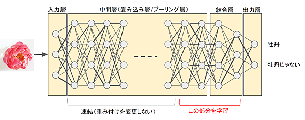 図3は、バラを判別できる学習済AIモデルを使って牡丹を見分けるAIを作るものです。通常の機械学習がイチから学習するのに対し、ここでは中間層の大部分の重みを凍結し、残りの少ない層のみで学習します。もともとバラを判別するのに適した重みとなっているので、似たような判別ならその重みバランスを利用して、少ないデータ、少ない回数で学習できます。