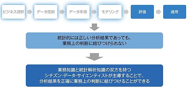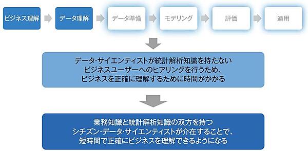 そのため、正しい理解を得るために時間がかかる、あるいは誤った理解の下で作業を進めた結果、最後の「適用」工程で分析結果が的外れであることが判明するといった問題が発生していました。今後は、業務知識と統計解析知識の双方を持つシチズン・データ・サイエンティストが介在することで、このような問題が解消されることが期待されています(図1)。