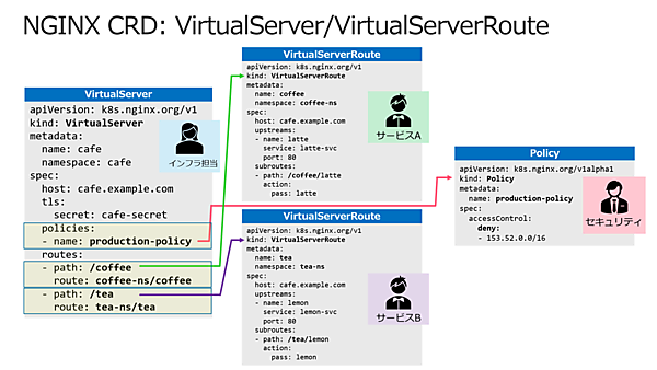 インフラ担当者がVirtualServerというリソースを書式に則って記述します。この例では、2つのサービスがありますが、それぞれに該当するURIを各サービスのVirtualServerRouteに紐付けます。また、これらのサービスが動作する環境は本番環境となりますので、別途セキュリティ担当者が定義したセキュリティポリシーをインフラ担当者が管理するVirtualServerで参照しています。それぞれの担当は担当外の設定を意識する必要は無く、またセキュリティポリシーなどは別のチームが作成したポリシーを要件に応じて選択・参照することで要件を満たすことが可能となります。