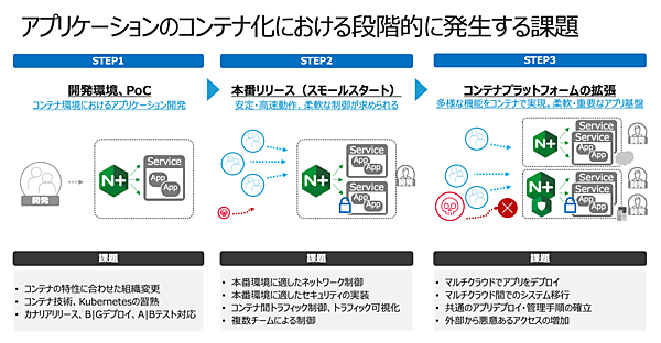 コンテナ・Kubernetesの利用を開始した際には、まずそれぞれのテクノロジーが持つ特徴を理解し、組織やチームが求めるゴールに向かってアプリケーションの開発を進めていきます。その後、本番環境でのアプリケーションの稼働が開始します。外部との接続により様々な通信が流れ始めますので、プラットフォームを安定させるための制御やセキュリティの実装、可視化が必要になり、これらの制御を各チームが並行して柔軟に実施する必要があります。そしてサービスが拡大すると、デプロイするアプリケーションが増え様々な要件に対応しながらも、プラットフォーム全体として高い安定性とセキュリティを実現する必要があります。