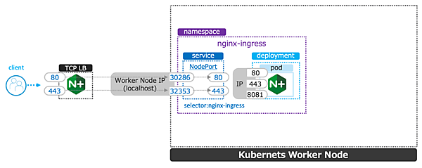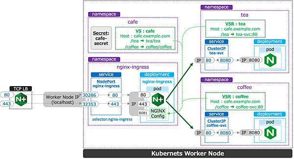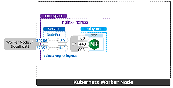 NGINX Ingress ControllerでListenするポートを設定情報では明示していませんが、IngressやVirtualServerで設定を行った場合は、記述内容に合わせてHTTP(TCP/80)、HTTPS(TCP/443)が処理される状態となります。
