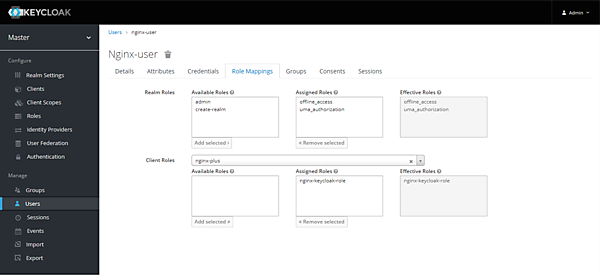 Role Mappingsタブを開き、Client Roles:nginx-plusを選択し、Available Rolesに表示されるnginx-keycloak-roleを選択し、「Add selected」でRoleをAssignします。