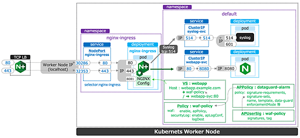今回の実装ではdefault namespaceに、WAFに必要となるリソースを実装しています。SyslogサーバはNGINX Ingress Controllerから内部ネットワークを通じて接続するため、外部への公開は行っていません。WebアプリケーションはWAFのセキュリティポリシーを参照し、VirtualServerの公開設定を行っています。これにより外部からWebアプリケーション宛のアクセスはセキュリティポリシーの内容に従って制御される構成となります。
