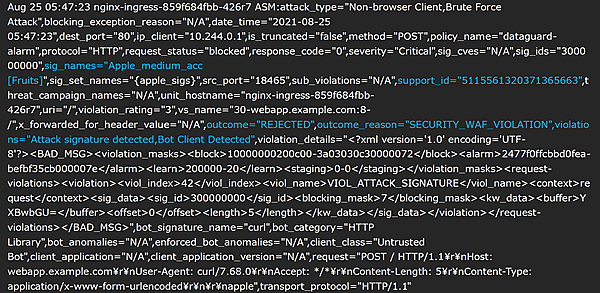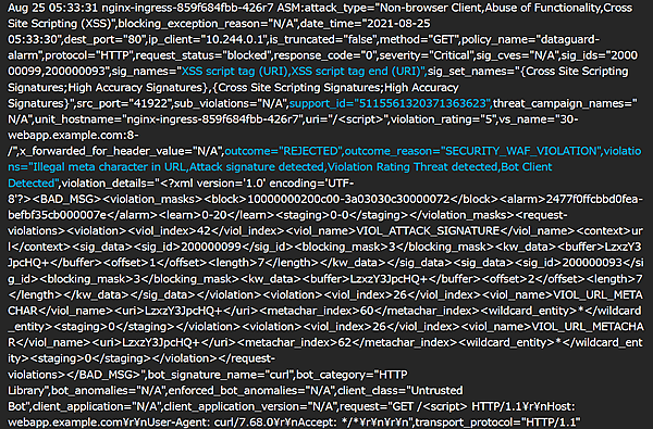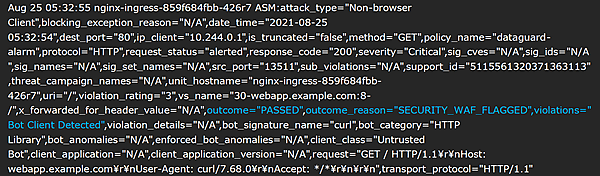 ログメッセージを見ると、通信をブロックせず転送(PASSED)していることが確認できます。NGINX App ProtectはBot Signatureの機能をもっておりますので、curlコマンドであることを“人によるブラウザの通信ではなくBot Clientである”という形で検知をしておりますが、即座に驚異であると判断される設定となっておりませんので適切な通信としてWebアプリケーションへ転送が行われております。