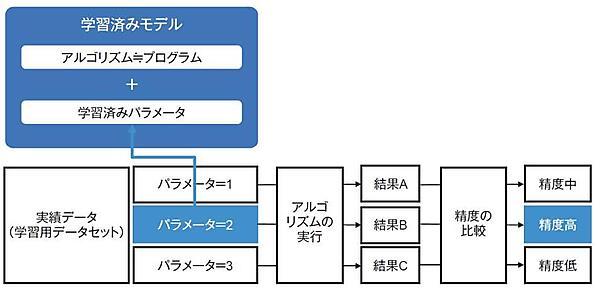 学習済みモデルとは、アルゴリズム(プログラム)と学習済みパラメータを組み合わせたものです。実績データ(学習用データセット)を使ってパラメータの値を変化させてアルゴリズムを実行した結果、最も実用的な精度が得られたものが学習済みパラメータです。図1では、パラメータを1から3まで変化させてアルゴリズムを実行した結果、パラメータが2のときに最も高い精度が得られたので、これを学習済みパラメータとして採用しています。