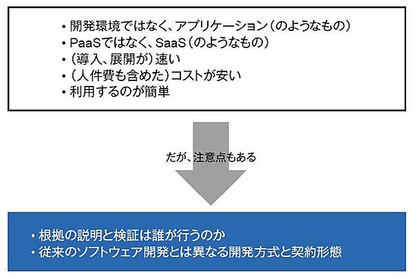 しかし、学習済みモデルを利用したシステムやサービスを使用する場合には、根拠の説明と検証は誰が行うのかというユーザーのデータリテラシ(分析結果を理解し、それを説明できる能力)と、従来とは異なるソフトウェア開発方式や契約形態に注意を払う必要があります。