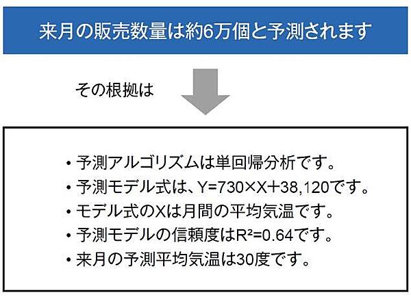 例えば、来月の販売数量は約6万個という予測結果が得られた場合、学習済みモデルを利用したシステム/サービスから提供される根拠の説明は図3のようになります。