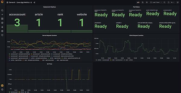 こうして、アプリケーション固有のメトリクスとKubernetesリソースのメトリクスを同時にPrometheusで扱えるようになりました。特にオートスケールするようなアプリケーションの場合、Deploymentリソースのレプリカ数やPodのステータスなどはアプリケーションメトリクスと合わせて表示しておきたいところです。ということで、可視化ツールのGrafanaを利用してダッシュボードで表示してみましょう。図ではDeploymentリソースのレプリカ数、Podのコンディション、リクエストのDurationとガベージコレクションの所要時間を1枚のダッシュボードにサマリしています。ちなみに、このGrafanaもHelmでインストールできます。