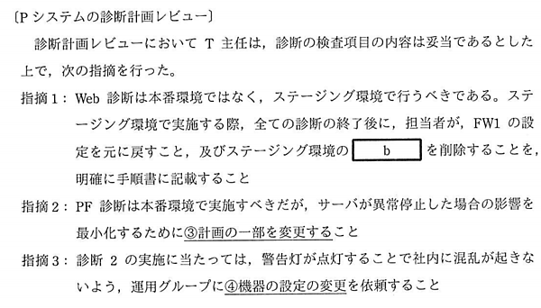 「b」については図1をご参照ください。この「指摘1」では、Web診断終了後の作業について言及されています。「FW1の設定を元に戻すこと」に関しては、問題文中「図3 診断要件」の2に則った措置と言えます。