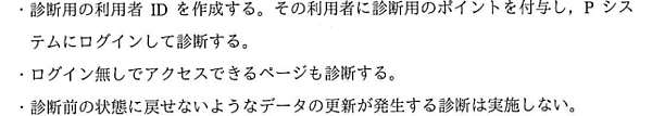 図3の「診断用の利用者ID」とは、今回のWeb診断のためだけに作成されたユーザーデータです。したがって、問題文中図3の2に記載の「設定及びデータ」に該当します。つまり、設問2(1)の解答は「診断用の利用者ID」です。
