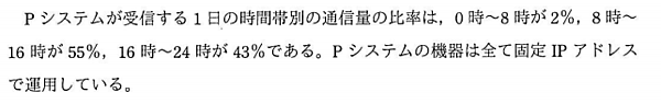 「0時~8時」の時間帯における通信量比率は「2%」と、他の時間帯と比較して極端に小さいことがわかります。したがって、この時間帯はPシステムの利用者が一番少ない=サービス停止時の影響が最も小さい、と考えることができます。つまりこの問題の解答は下記の通りです。
