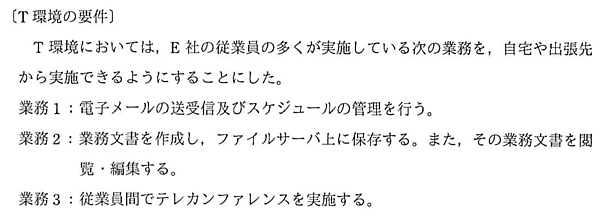 それでは、問題の解説に入ります。今回は、IT企業E社でのテレワーク導入に関する問題です。 問題の全体像を確認すると、この問題は2つの工程を含んでいることがわかります。