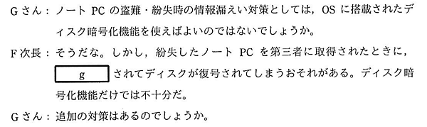 紛失した際に暗号化されたディスクへ実施できることとしては、「パスワードの推測や総当たりによりログイン」され、ディスクが復号されてしまう、が解答になります。