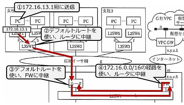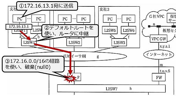 まず支社ネットワーク集約ですが、9ページ表1の通り、現在の支店では172.16.0.0/16に含まれるアドレスが全て利用されている訳でありません。そのため、例えば支店1のPCで172.16.13.1宛の通信が発生した場合、L3SW1はデフォルトルートを使い本社のルータを中継先として送信し、本社のルータもデフォルトルートを使いFWを中継先として送信します。しかし、FWには支社ネットワーク集約されたルート(172.16.0.0/16)がルータから伝えられていることから、中継先としてルータに送信してしまうことになりそうです。したがって解答は【ルータ】と【FW】の間になります。この設問も「図1中の機器名で答えよ」とあるので解答を記入する際は注意してください。