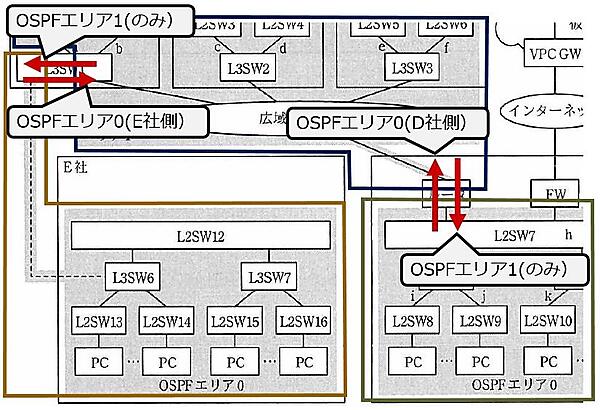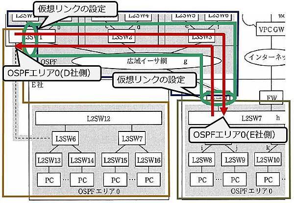 バーチャルリンクは、そのエリアとエリア0それぞれのエリア境界ルータ(ABR:Area Border Router)に設定することで動作します。12ページ図2を見ると、D社側とE社側のOSPFエリア0のエリア境界ルータはそれぞれ「ルータ」と「L3SW1」であることがわかります(図4)。したがって対象機器の解答は【ルータ】と【L3SW1】で、設定内容の解答例は【OSPF仮想リンクの接続設定を行う。】などとなります。