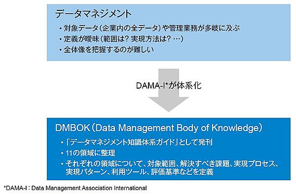 そこで、今回からはテーマを「データマネジメントの基礎を学ぶ」と改め、データマネジメントを体系化したDMBOK(Data Management Body of Knowledge)の概要と、その最新版で追加されたデータ統合領域を解説するとともに、データマネジメントの高度化ステップについて考察していきます。