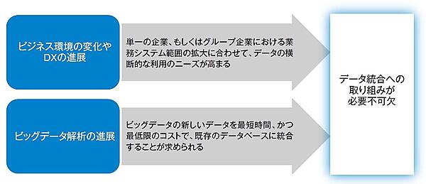 もう1つは、ビッグデータ解析の進展です。ビッグデータのデータソースは、今までにはなかった新しいデータであることが多く、これを最短時間かつ最低限のコストで、既存のデータベースに統合することが求められています。