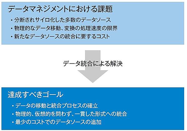 DWHにおいては、データの移動と統合は物理的に行われるため、データソースが多様化し、データ量が増大するにつれて、移動と統合に要する時間は長くなります。また、IoTから入手されるデータのようなリアルタイム性の高いデータソースからの移動と統合には、従来のDWHでの物理的な統合では処理速度が不足します。このような状況でデータ統合を実現するには、物理的だけでなく、仮想的な方法も併用したうえで、論理レベルで一貫した形式へのデータ統合が必要です。