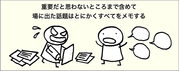 そこで筆者がおすすめしているのは「インタビュー中に出た話題はとにかくすべてをメモする」というテクニックです。ポイントはとにかくすべてをメモし、場に出た話題は何が重要かという判断はせず、同じ重みで記録します。