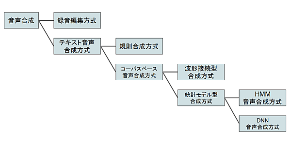 図1は音声合成方式の発展の様子を体系化したものです。音声認識と同じく音声合成もかなり前から取り組まれていて、最初の基本的な方式は「録音編集方式」と「テキスト音声合成方式」の2つでした。