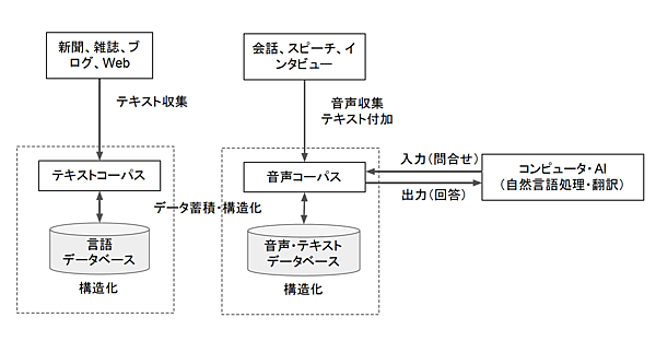 コーパスとはテキストを集めた大規模言語データベースです。新聞、雑誌、ブログ、Webなどのテキスト文を大量に集めて、コンピュータが利用しやすいように構造化して格納しています。そして、文字データだけではなく音声データも集めたものが音声コーパスになります(図2)。