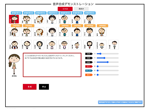 AI Talkは、株式会社エーアイの音声合成ソリューションです。ホームページに図3のような音声合成デモンストレーションがあり、自分で入力したテキストをいろいろなキャラクターの音声で聴くことができます。
