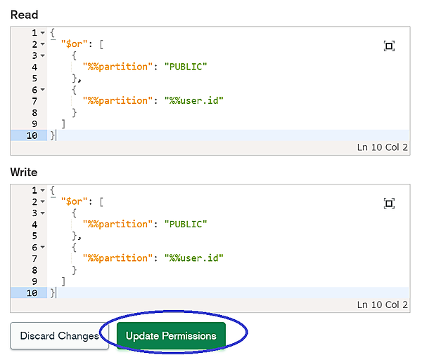 { "$or": [ { "%%partition": "PUBLIC" }, { "%%partition": "%%user.id" } ] } - [Update Permissions]ボタンをクリックする
