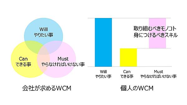 やりたいこと=Willを考えるとき、「Will-Can-Must」の考え方があります。自分のやりたいこと、自分ができること、会社から求められ、やらなければいけないこと、この3つの円が重なる部分で目標設定をしていきます。会社での目標を設定する際にWill-Can-Mustを利用するのも良いと思いますが、それとは別に個人のWill-Can-Mustも用意すべきだと思います。