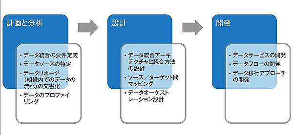 データ統合の実現プロセスは、計画と分析、設計から開発へと至る一般的なシステム開発プロセスに従いますが、各フェーズでの作業項目のなかで、データリネージ(組織内でのデータの流れ)の文書化、およびデータオーケストレーション設計からデータフローの開発に至る一連の作業は特に重要であり、特徴的なものと言えます。