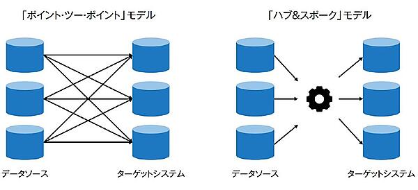 EAIツールは「ハブ&スポーク」 モデルでのAPIを介したアプリケーション間連携を可能にします。ETLツールによるETL処理がバッチ型で実行されるのに対して、EAIツールを使って実装されたETL処理はソースシステムでのデータの追加や更新をきっかけに起動するイベント駆動型で実行できます。