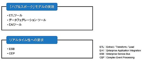 データフローの実装においてリアルタイム性が要求される部分には、メッセージ交換による非同期な連携を可能にするESB(Enterprise Service Bus)やルールベースでリアルタイム処理を行うCEP(Complex Event Processing:複合イベント処理)が利用される場合もあります。