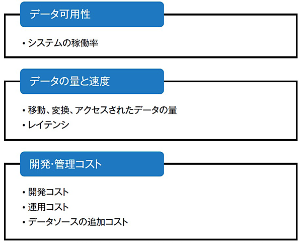 データ統合の運用段階では、データ統合の実現度合いを評価する必要があります。その際の基準となるのがデータ可用性、データの量と速度、開発・管理コストの3項目です。