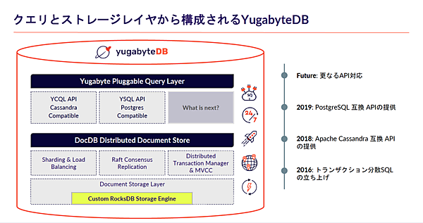 YugabyteDBは、Google Spannerに着想を得て開発されたトランザクションやクラウドネイティブアプリケーションのための分散SQLデータベースです。インタフェースはPostgreSQL及びCasaandra互換で、分散ということで水平方向へのスケーリングが得意なだけではなく、トランザクションも担保できるようになっています。また、ノード数が増えても高可用性を維持し、問題発生時の回復力も充実しています。グローバルでも採用事例が増えてきているそうです。
