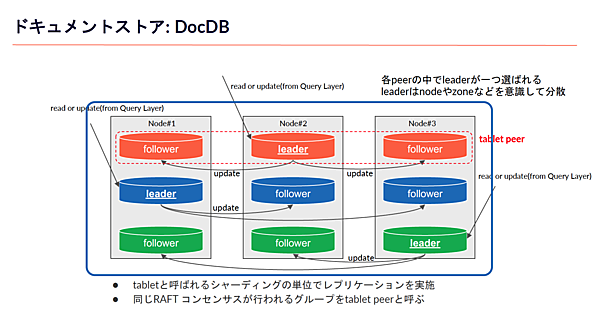 ドキュメントストアレイヤでは、tabletと呼ばれるシャーディングの単位でレプリケーションを実施しています。下図にあるように、各ノードの中からleaderが1つ選ばれ、他のノードがfollowerノードになります。さらにこのleaderが特定のノードに集中しないように配置される仕組みになっています。