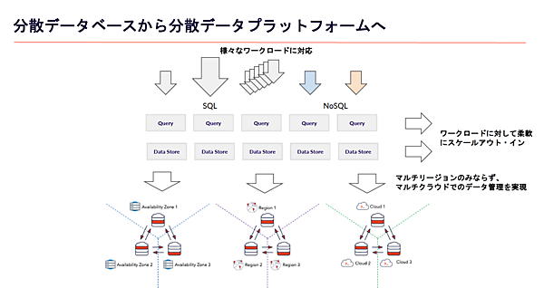 最後に、Yugabyteの目指すところが示されました。単なる分散データベースではなく、さまざまなワークロードに対応し、柔軟にスケールするような環境を提供することで、マルチクラウドでのデータ管理を実現する分散データプラットフォームの実現です。使い慣れたPostgreSQLのようなインタフェースで簡単に分散化できる環境が構築できれば、これまでクラウド移行を阻む要因となることの多かった従来型のデータベース技術に置き換わる新しい選択肢として、企業のクラウドジャーニーが加速されることが期待できるのでは、と考えます。