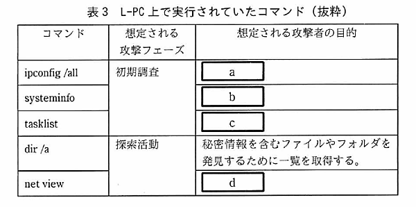 表3を下記に示します。設問2はマルウェア感染が確認されたPCで実行されていた各コマンドの想定される攻撃者の目的を問われる問題です。