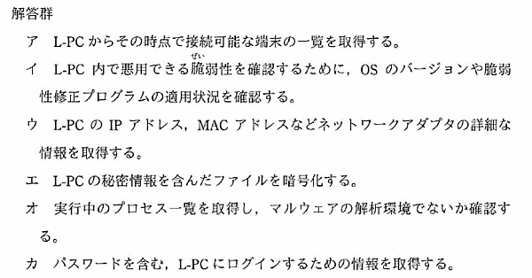 イ L-PC内で悪用できる脆弱性を確認するために、OSバージョンや脆弱性修正プログラムの適用情報を確認する。