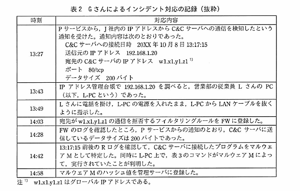 Pサービスの仕様上、過去のログを分析することは不可能なため、FWログの確認によりマルウェアの通信を調査しています。標的型攻撃は長期に渡り一連の攻撃行動が継続することもあるので、攻撃に気づいたときには既に複数の端末にマルウェアが侵入している可能性も考えられるでしょう。このような場合に対処するため、各種ログの保存期間は各企業ごとに妥当と思われる期間を精査し定めることが重要となります。